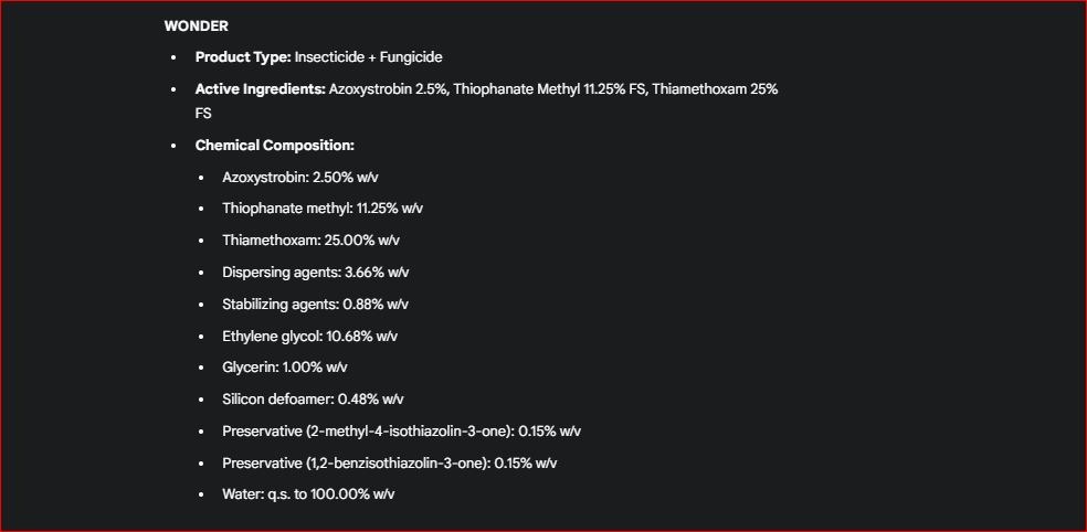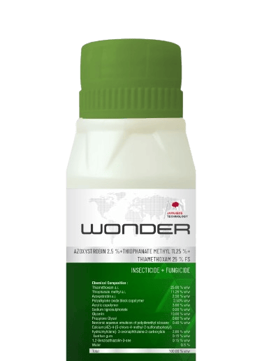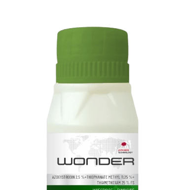 WONDER is an advanced agricultural solution that provides dual protection to your crops by acting as both an insecticide and a fungicide. This innovative formulation combines Azoxystrobin and Thiophanate Methyl for fungal control, along with Thiamethoxam for insect pest management. It offers comprehensive protection against a wide spectrum of chewing and sucking insects, as well as various fungal diseases, ensuring your crops remain healthy and productive from multiple threats.